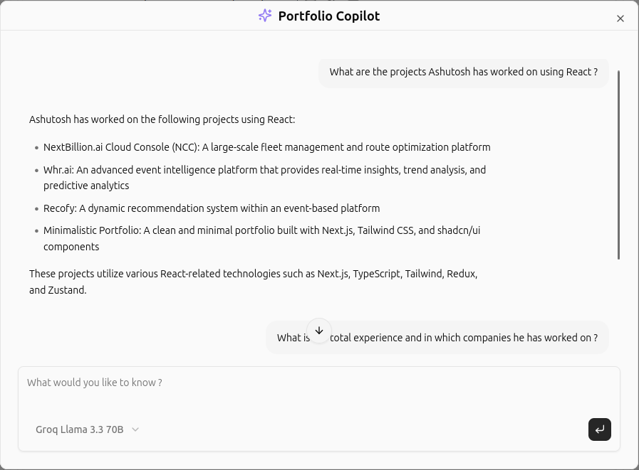 Built an intelligent chatbot integrated directly into my portfolio to answer recruiter and hiring-related queries in real time. The agent understands context, retrieves structured information from my resume, portfolio metadata, and project history, and responds with human-like clarity. Includes conditional logic for confidential questions, scheduling prompts, and JSON-based responses for structured outputs.