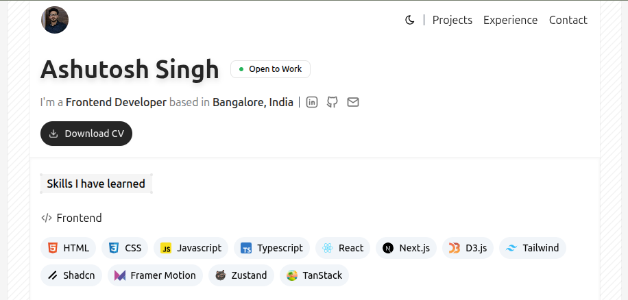 A clean and minimal portfolio built with Next.js, Tailwind CSS and shadcn/ui components, focused on performance, responsiveness, and showcasing projects with clarity and simplicity.